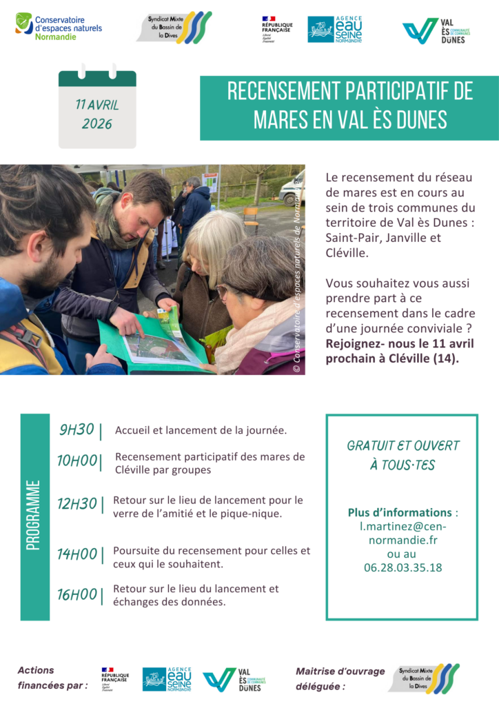Dans le cadre de son partenariat avec le Conservatoire d’espaces naturels de Normandie et du Programme de Restauration des Mares (PRAM), la Communauté de communes vous invite à participer au recensement participatif organisé sur notre territoire :